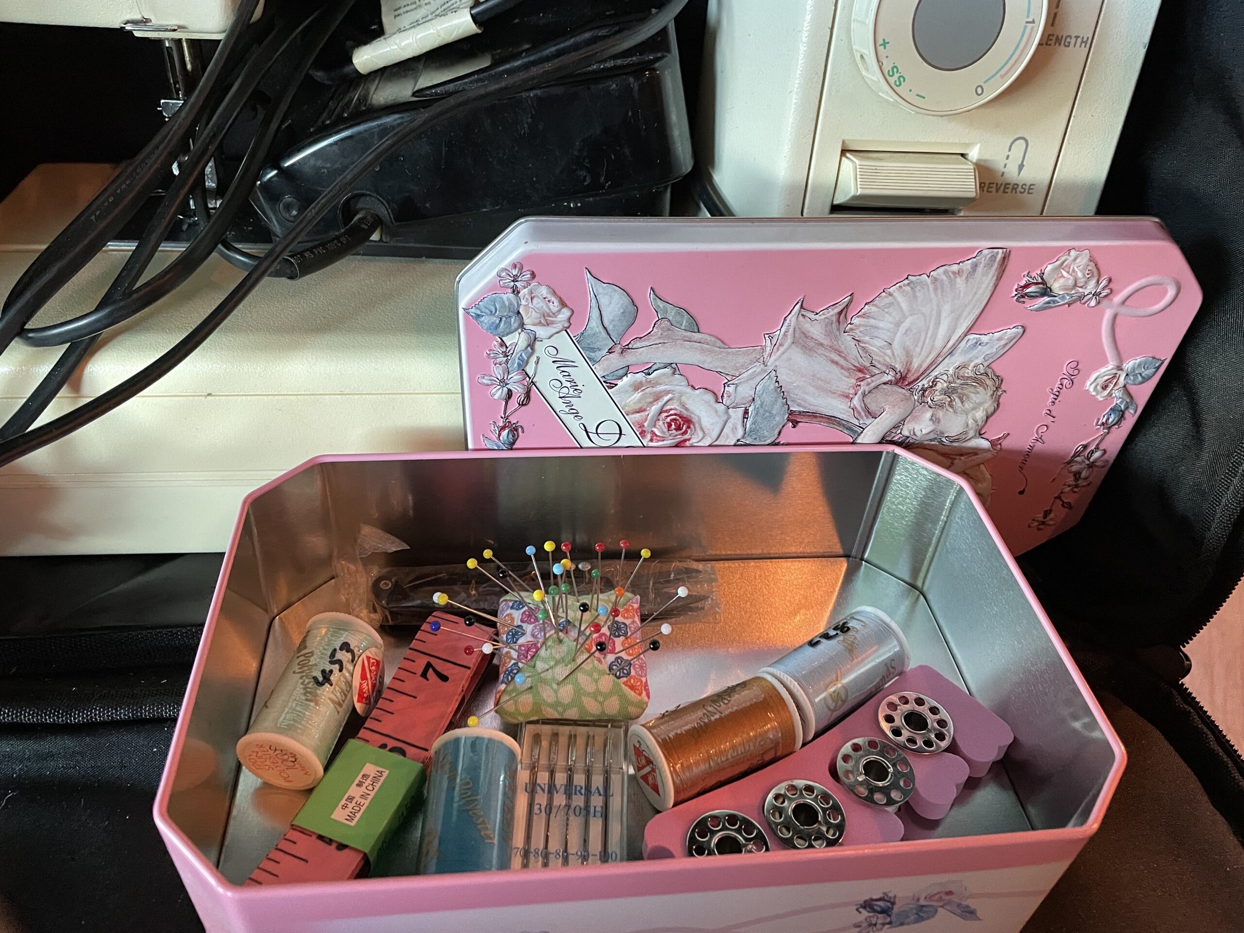 December 2021 – this old girl was gifted to me by Lynda and after some cleaning and adding in a tin of sewing tools and accessories, she went off to her new home with Abigail and her two daughters…..